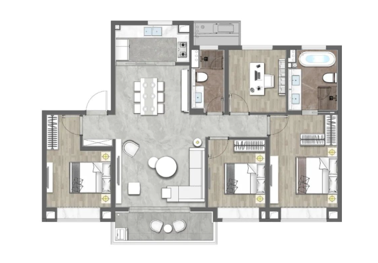 该户型做到了四开间朝南+南北通透+主卧套房设计+全南卧带飘窗,一步到位的大4房。