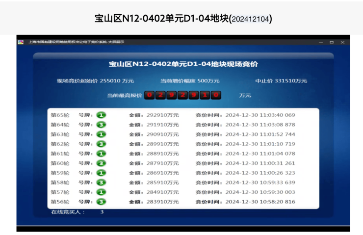 随后上午10点,上海土地市场官网全程直播宝山区N12-0402单元D1-04地块出让,共3家竞买人参与现场竞价环节。经过65轮报价角逐,最终被金茂&招商联合体拿下,成交总价29.291亿元,溢价率14.86%,楼板价38479元/平方米。