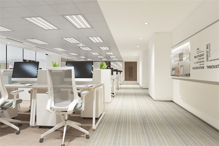 目前最普遍的也最常见的一种办公室设计就是开放空间的设计,这种工作空间适用于大多数普通工作。简单来说,就是打工人们共享一张长的工作台,座位相邻,彼此之间沟通方便,销售部或市场部这类经常需要沟通合作的打工人就非常适用哦!