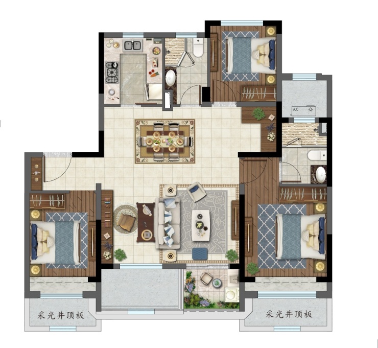 该户型较大的特点,是动线明确,布局合理,三房互不干扰,满足 “三代同堂”的居住理想。动静分离,起居、家务动线不交叉,私享个人空间、又能随意共聚天伦;主卧套房独立盥洗室、次卫干湿分离,尊贵、便捷居家体验;儿童房紧邻主卧,藏于北面安静一隅,便于生活一步照顾,臻享温馨入眠。
