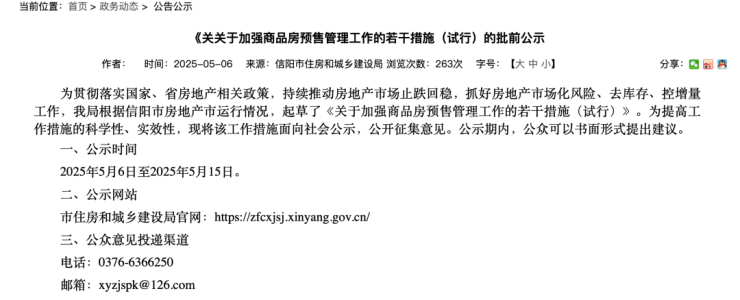 日前,信阳市住建局印发《关于加强商品房预售管理工作的若干措施(试行)的批前公示》(以下简称《批前公示》),严控预售许可条件,严格预售资金缴存,规范预售资金使用,严格实行项目开发公司制,合理把握工程进度,准确界定新出让土地。