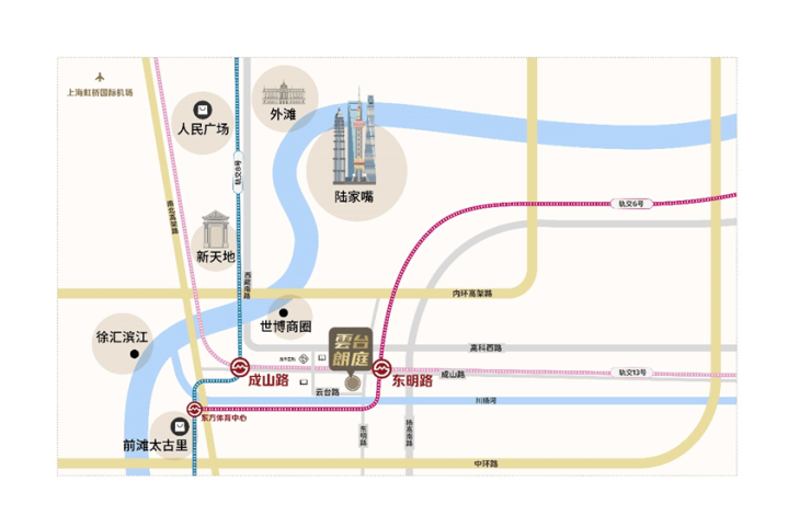 项目位于浦东云台路,距离6/13号东明路站约600米,步行9分钟可达。自驾方面,可以无缝衔接成山路、西藏南路隧道、南北高架路直达市中心,不论是地铁还是驾车,便捷通达全市繁华区域,交通条件是相当不错的。