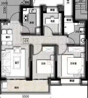 约87㎡3房2厅1卫户型整体方正,全明采光,三开间朝南。南向大面积阳台连接客厅和卧室;卫生间干湿分离,避免了安全隐患;每间卧室都附带飘窗,采光效果佳。