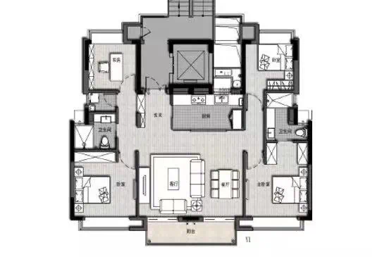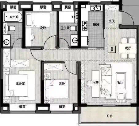 约113㎡3房2厅2卫户型,比前两个户型更为方正,整体动静分区,同样也是三开间朝南设计,采光充足。进门玄关设计,增加了住户回家的仪式感,也比较实用;两个卫生间都是三分离设计,干湿分开,避免安全隐患;主卧套房设计,带有独立的衣帽间及卫生间,保证了住户生活的私密性;每个房间都附带有飘窗,包括卫生间。