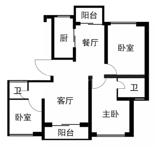 三开间朝南,南北双阳台,采光通风较好,主卧套房设计,自带独立卫浴,是个比较常见的3房设计,不过在户型面积上更为宽裕一些。