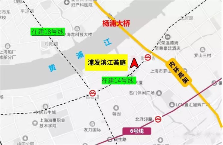 项目东北侧为内环高架和杨浦大桥,过江即是杨浦东外滩板块。项目距离在建的14号线歇浦路站仅约150米,距离6号北洋泾路站约1公里。