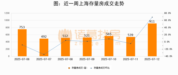 从存量房来看,2025年07月12日上海存量房单日成交911套,比昨日增加372套,环比上涨69%。从近一周存量房成交来看,上海存量房日均成交套数为613套,07月12日单日成交911套,高于近一周平均水平48.6%。