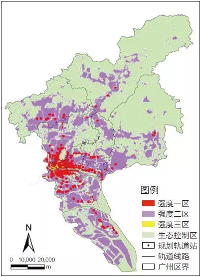 (1)功能、强度等分区控制与指引。广州、深圳等地对城市更新地区分别进行了功能指引与开发强度等的分区控制。例如《广州城市更新总体规划》根据现行控制性详细规划成果与轨道线网规划,将城市用地划分为四类强度控制分区(图 10),作为更新片区与项目单元实施的重要参考 。