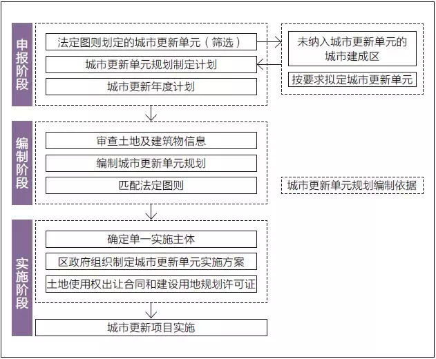 深圳依据全市城市总体规划和土地利用规划,按照国家“五年计划”的周期编制《深圳市城市更新规划》,指导深圳城市更新工作。其中,拆除重建类城市更新需要严格按照城市更新单元规划、年度计划的规定进行实施,主要分为申报、编制、实施三个阶段(图 8)。