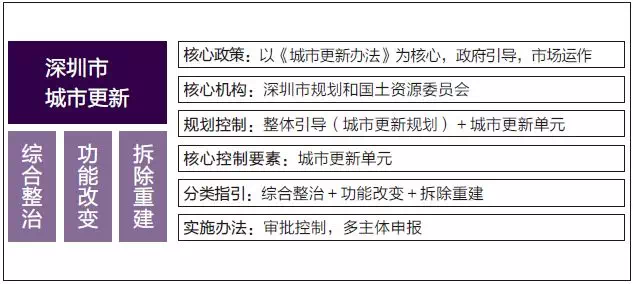 深圳城市更新制度体系(图 3)的核心机构为深圳市规划和国土资源委员会,政策突出“法制化、市场化”特点,将城市更新分为“综合整治、功能改变、拆除重建”三类进行分类指引。