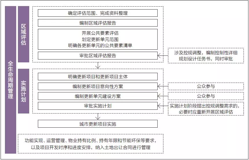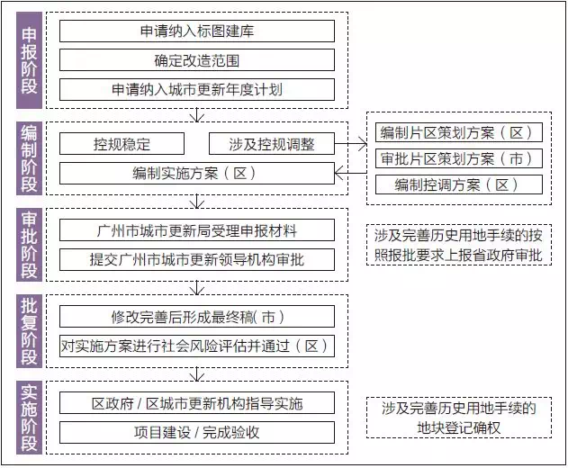广州市城市更新工作施行“三旧”分类管理,“全面改造、微改造”分层实施的“分类分层”管理制度,整体流程分为申报、编制、审批、批复、实施五阶段(图 7)。