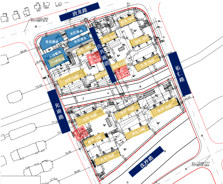 根据设计方案显示,共计11栋16层住宅楼,和4栋14层住宅楼。另设2-3层社区商业于地块西北角,即唐龙路、允迪路路口。