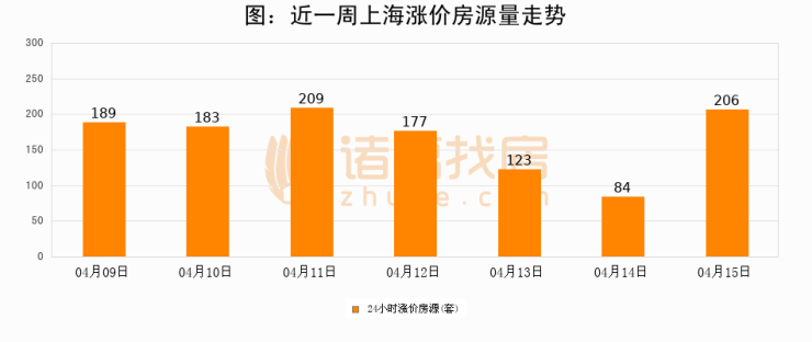 根据诸葛找房数据显示,上海24小时涨价房源量为206套,较04月14日增加122套,环比上涨145.2%。与此同时,涨价房源占比小幅扩大,业主信心有所提升。