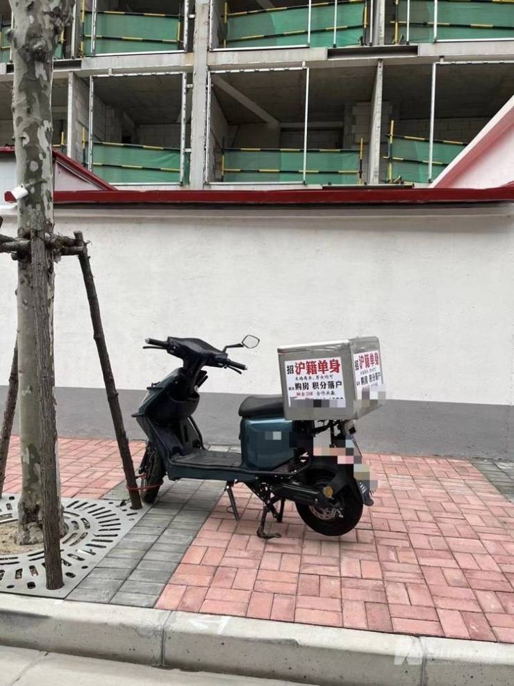 有意思的是,在工地的西侧、南侧和东侧,记者共发现4辆电动车停在路边,车身贴着“招沪籍单身,未婚离异,男女均可,配合新房摇号、积分落户,合作共赢,酬金20万”等广告,并附有电话号码和微信二维码。