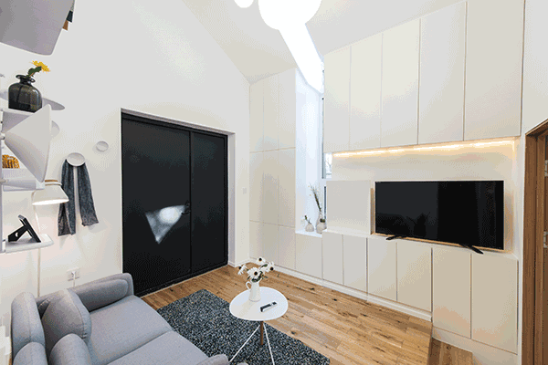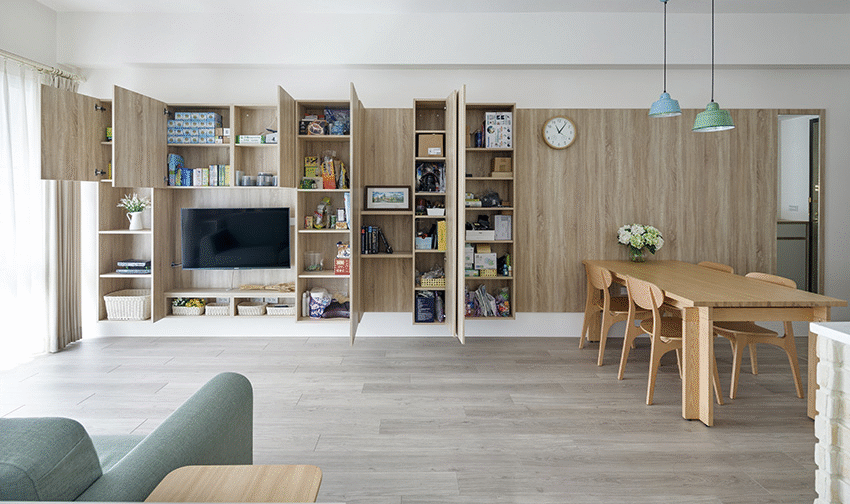 客厅需要收纳的东西比较多,又想保持隐私性,那你可以考虑密封内嵌式电视收纳柜。顶天立地式上接吊顶,紧贴墙壁做成成排储物柜,这样客厅就一下子多了十几个储物柜。