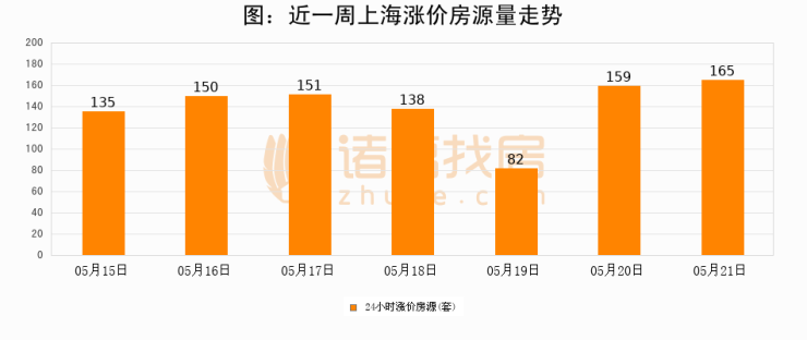根据诸葛找房数据显示,上海24小时涨价房源量为165套,较05月20日增加6套,环比上涨3.8%。与此同时,涨价房源占比小幅扩大,业主信心有所提升。