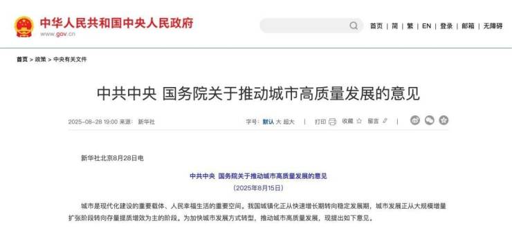 8月28日晚,《中共中央 国务院关于推动城市高质量发展的意见》(以下简称《意见》)正式对外公布,明确提出要“激活城市存量资源潜力”,系统推进“好房子”和完整社区建设,加快构建房地产发展新模式。