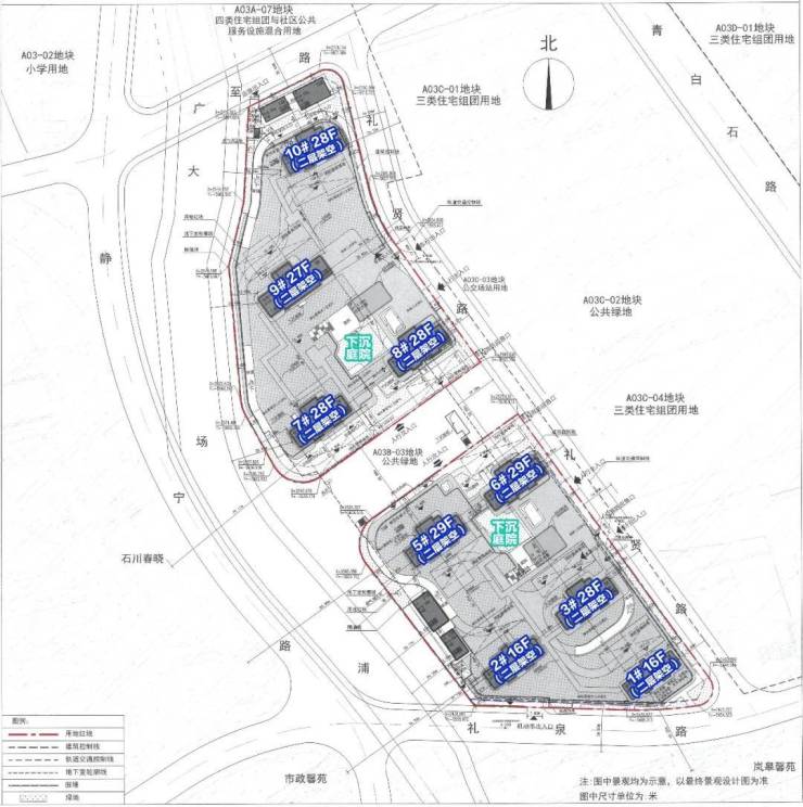 根据方案,A3a-03与A3a-04地块将统一规划、整体开发,容积率分别为2.8、2.2,总建面约15万㎡,拟建14幢14–17层小高层住宅及1幢16层保障房,住宅装修标准不低于3000元/㎡。建筑限高分别为80米和60米,楼间距大多约30米,最大约58米,新建围墙高度约2.2米。