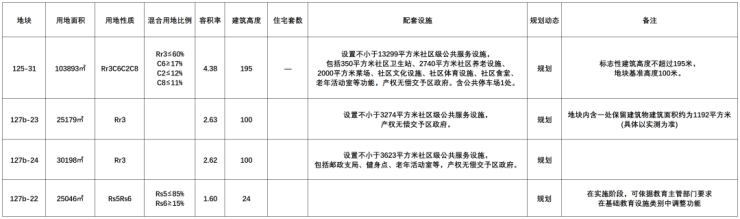 125-31地块体量最大,用地面积103893㎡,性质为混合用地,Rr3≤60%,C6≥17%,C2≤12%,C8≤11%,4.38的容积率,住宅体量约27.3万方。