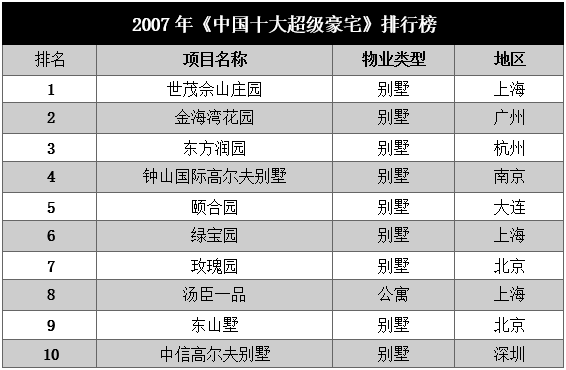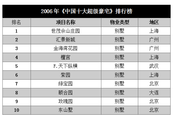 2006年,魔都豪宅强势占领了《中国十大超级豪宅》榜的4个席位,除了前面提到的檀宫、紫园和绿宝园外,新上榜世茂佘山庄园更是力压众豪宅排在了第1位。世茂佘山庄园总共上过两次榜,两次都排名排名前列!