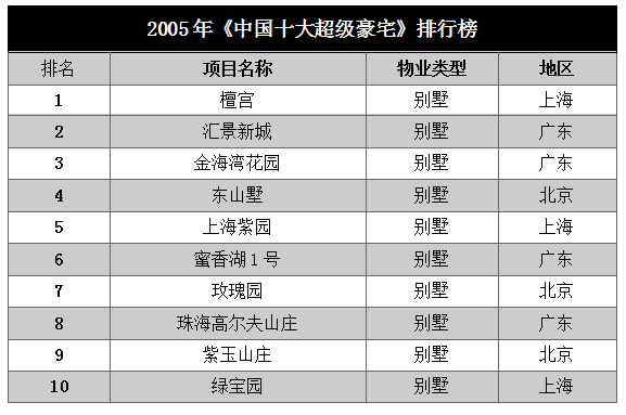 2005年的《中国十大超级豪宅》榜魔都也有3个楼盘上榜,2004年曾上榜的檀宫和紫园,依然十分给力的排在了第1和第5位,而新上榜的豪宅“绿宝园”则排第10位。