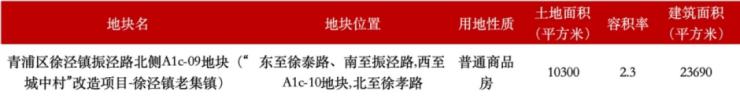 出让资料显示,该地块为徐泾镇老集镇“城中村”改造项目,地块东至徐泰路,南至振泾路,西至A1c-10地块,北至徐孝路。