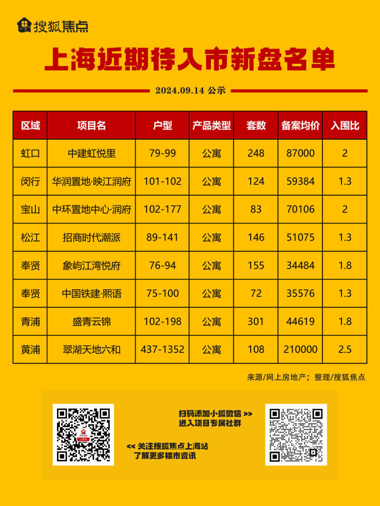 9月14日,据网上房地产最新公示,上海8盘1237套房源近期待入市。项目分布于虹口、闵行、宝山、松江、奉贤、青浦