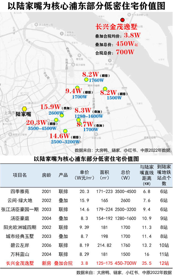 对比陆家嘴至长兴岛一带部分低密住宅的价格会发现,整个低密住宅带呈现出由西向东价格递减趋势,长兴金茂逸墅450W起的叠加,价格优势十分明显。