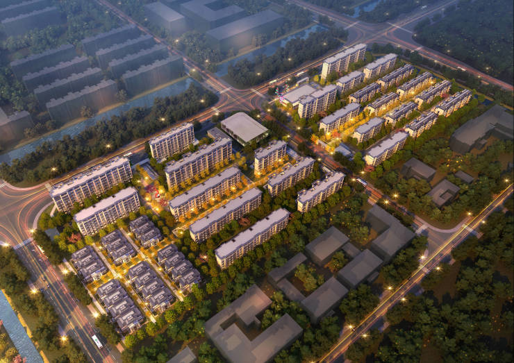 长兴金茂逸墅三面环水、东西分区,容积率约1.2,四层纯正叠墅和三层合院产品合理布局,整个社区拥有更低的天际线,更大的楼间距,更舒适的居住体验。4层叠墅总高约12.6米,根据卫星地图测量楼栋距大概在13米左右,栋距/楼高比值超过100%,在保证采光、通风的同时,防疫效果更佳。
