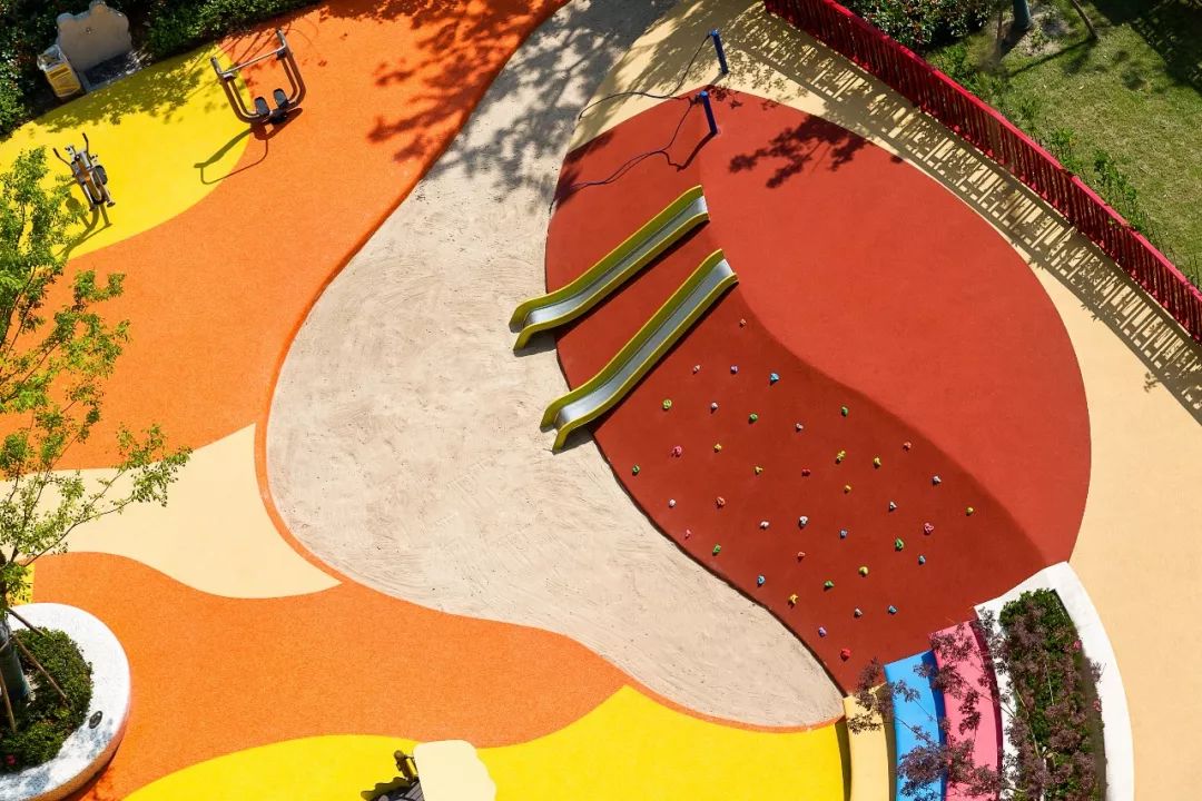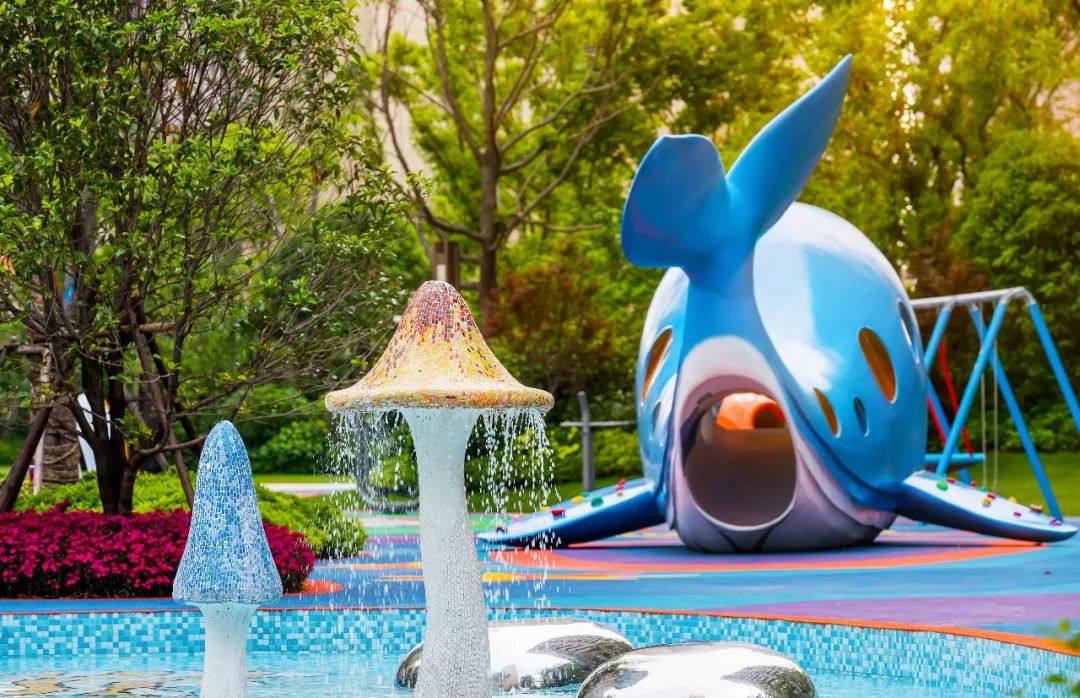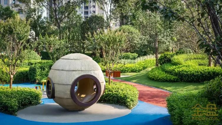 从东入口的会所往里走,便是让人眼前一亮的户外游泳池。从空中鸟瞰整个泳池,花瓣形的游泳池使整体环境景观变得活泼、生动、使周边空间围绕它产生富于变化的趣味。与周围景色优质融合,达到独特的视觉效果,同时也为周围的景色增添了一份光彩。同时,花瓣形状柔化了场地的边界,与周边密林、建筑构成了空间不同的层次感。游泳池边结合了岸边躺椅区和种植区,使岸线在规整化中也不失空间的丰富、生动和活泼趣味。泳池的设计,吸引住户们走向户外,在精心打造的绿荫中尽情放松。