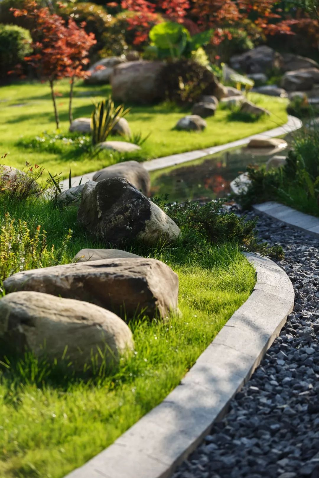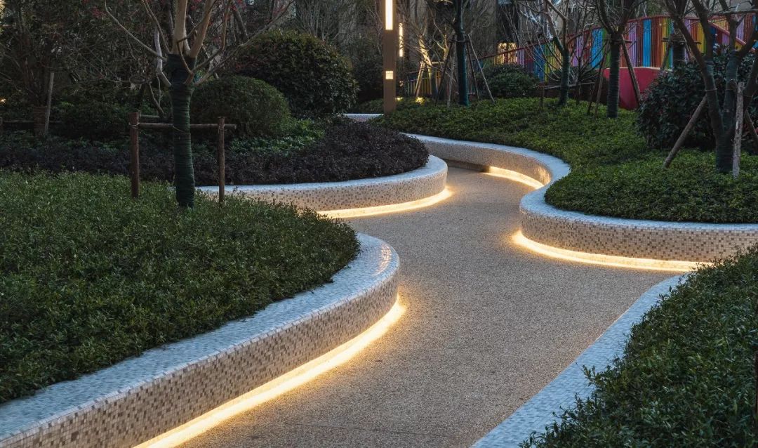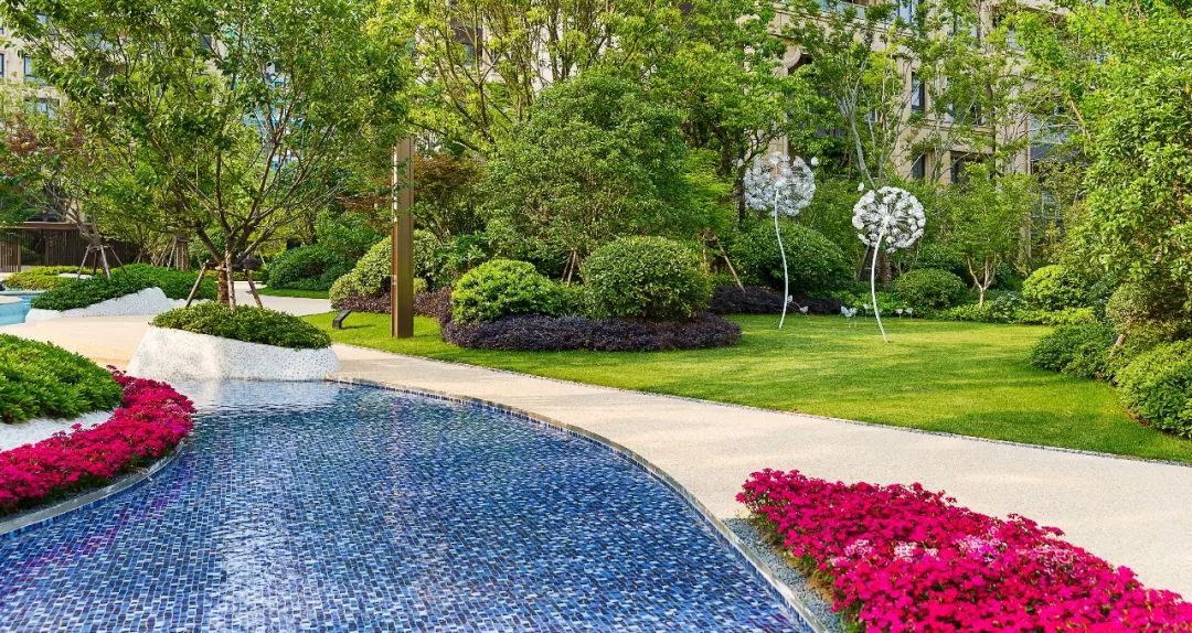 現代簡約的硬景佈局與多樣的植物空間形成視覺對比,流暢的曲線形園路、現代風格的構築物、自然式池塘相互融合。自然而豐富的軟景烘托硬景的現代質感,形色各異的喬木、灌木及開花地被打造出自然式的戶外花境,為住戶帶來鋪撲面而來的自然清新之美。