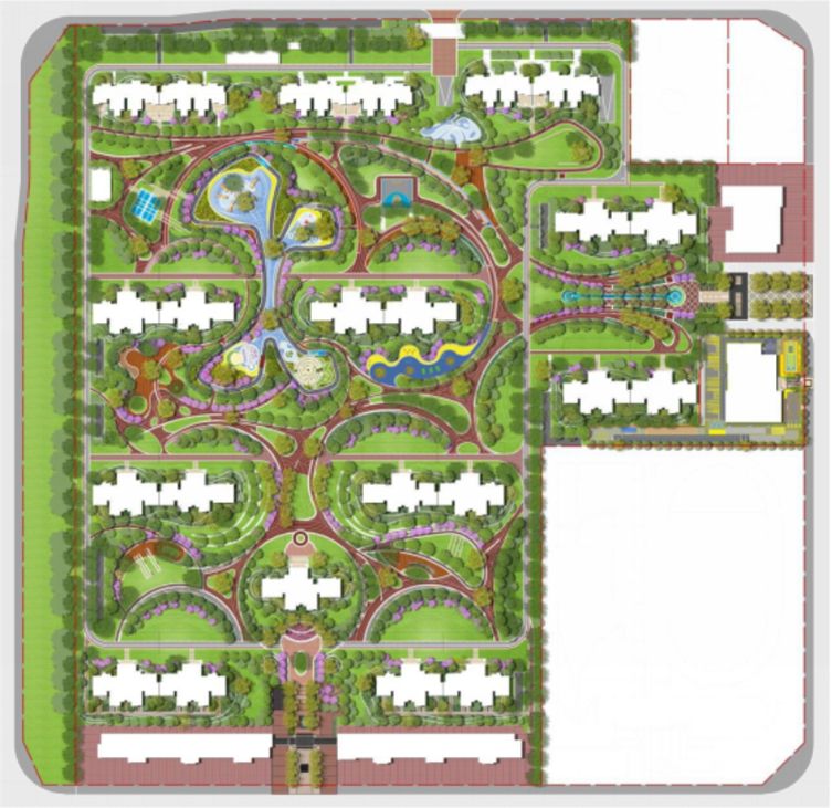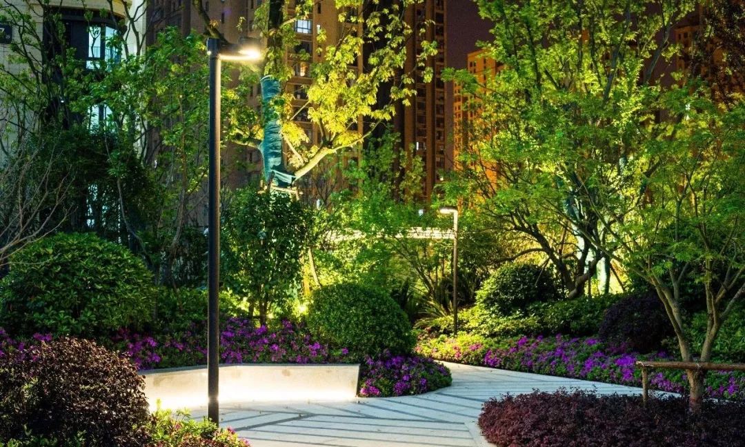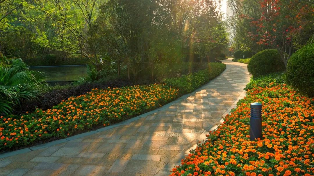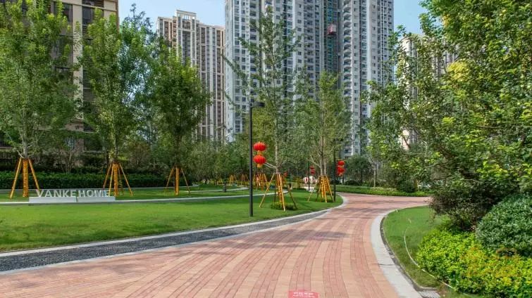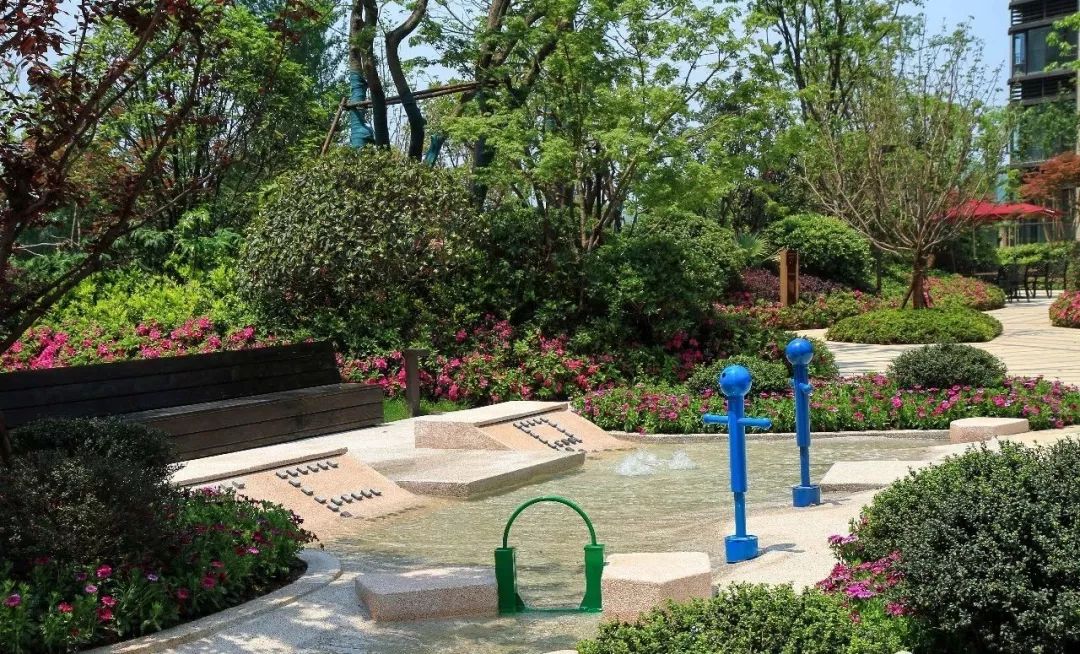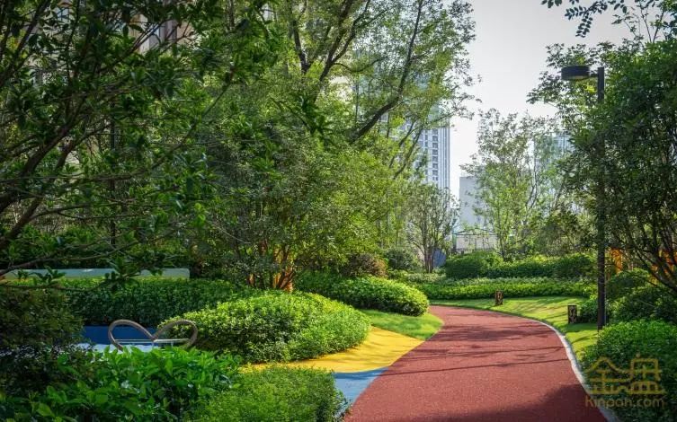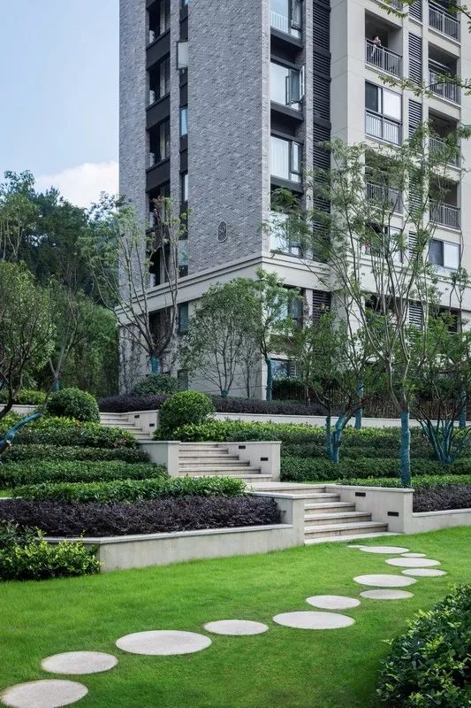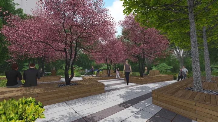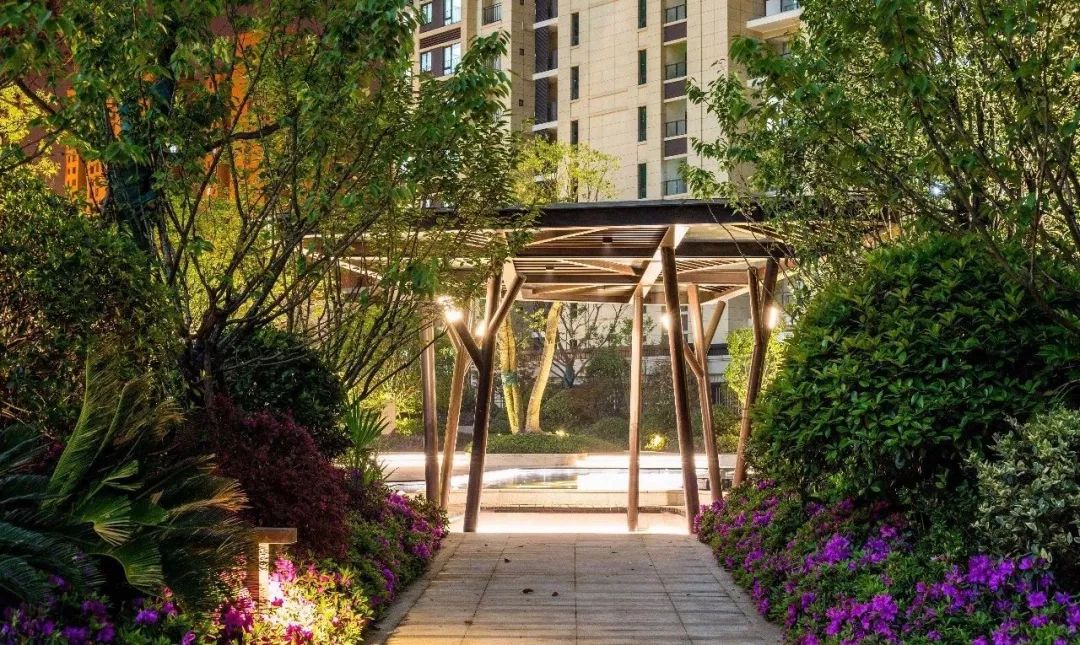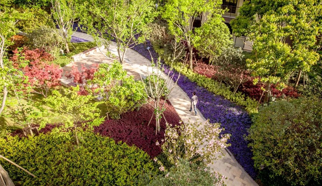 在宅間及建築入口配置花期較長的開花喬木;中層搭配紅楓、海棠、櫻花;下層種植杜鵑花,山茶花、紫荊等各種開花灌木,以及色澤豔麗的時花,讓居住者在出入之間時刻感受著這一份春風宜人。