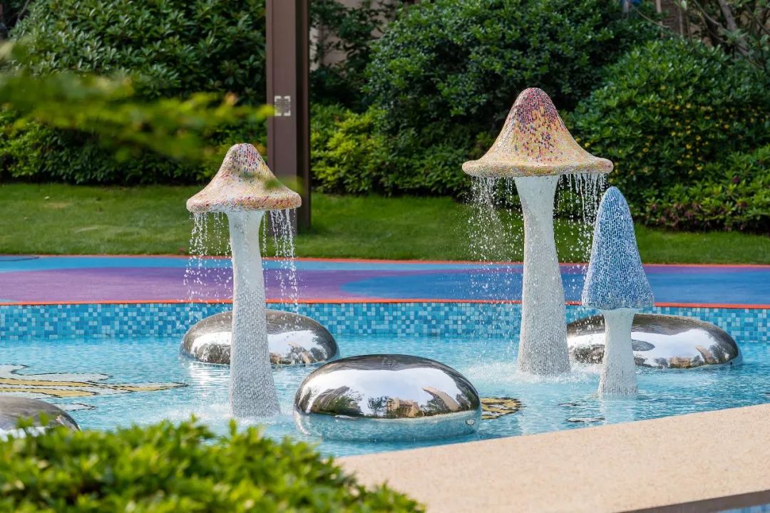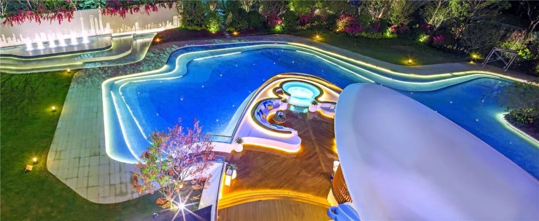 从东入口进去,中间有个很大的水景,阶梯式跌水,水流湍流而下,体现恢弘气势。水景后面是迎宾会所,从会所再往里面进去会看见这个项目的爆点所在——户外花瓣形的游泳池。