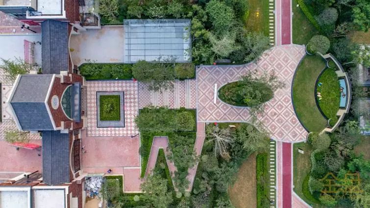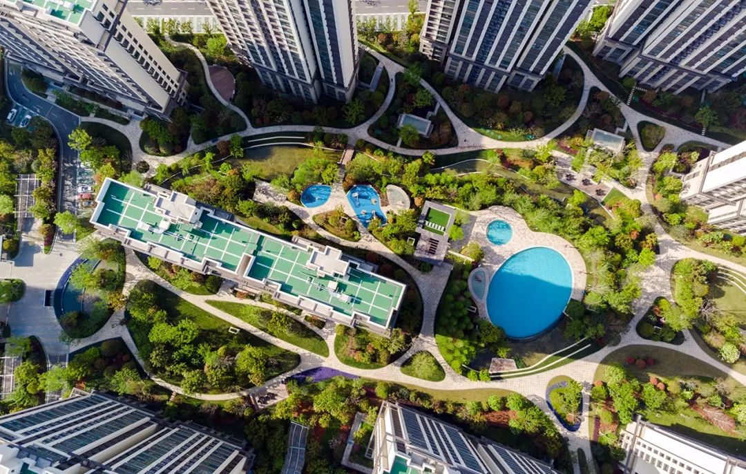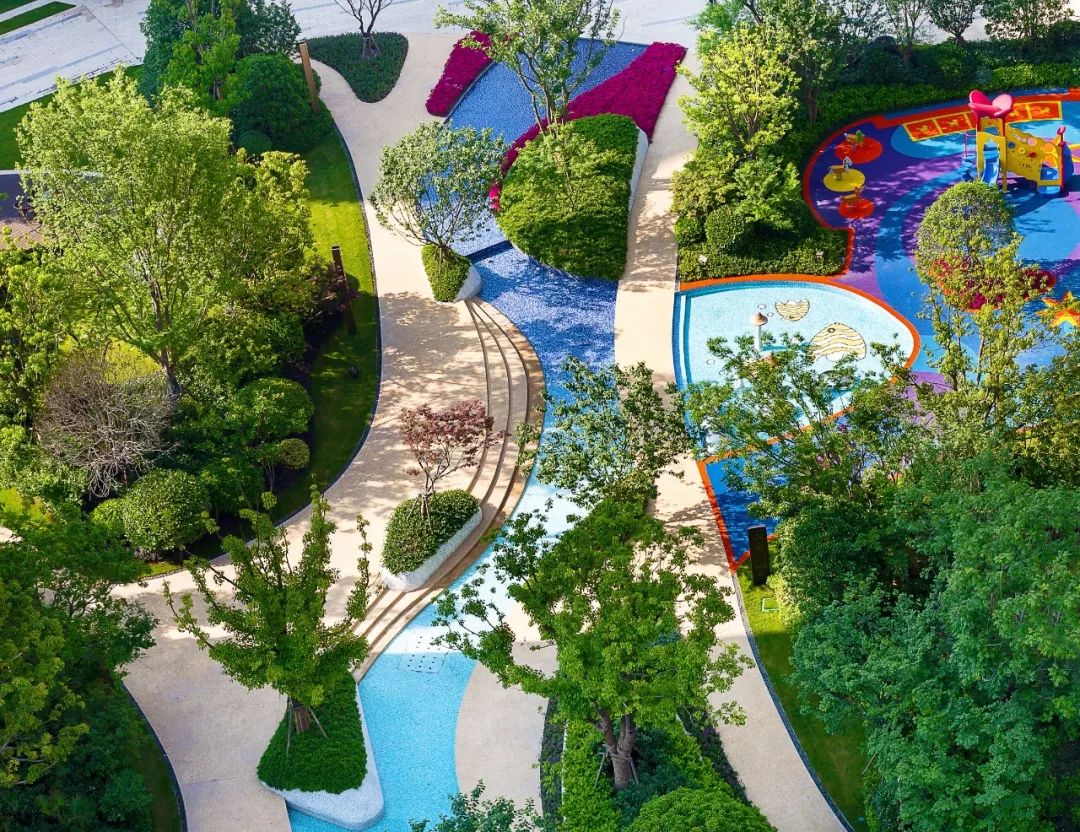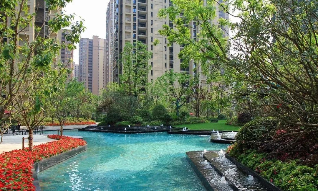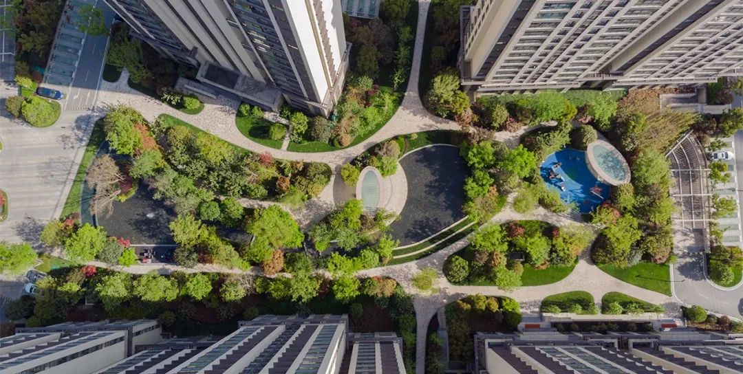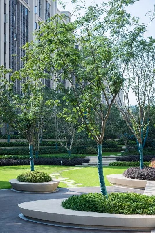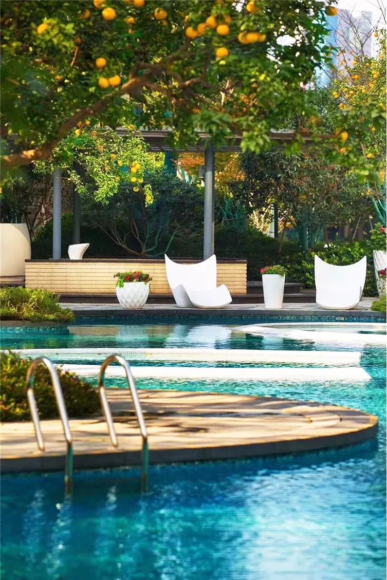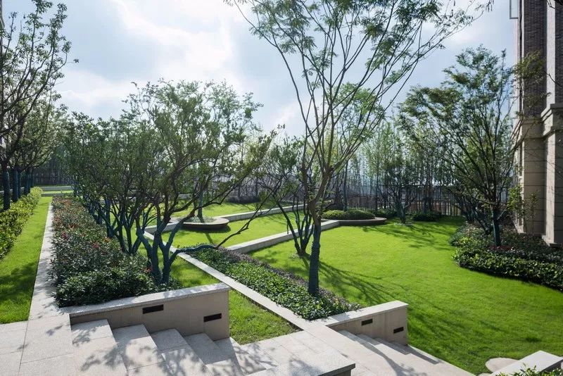 由超大泳池及各節點花園所組成的中央景觀花園種植不同質感的植物,環繞自然水池、座椅和中央廊架,營造鬱鬱蔥蔥的軟景空間。上層選用了整齊圍繞泳池的銀杏林;中層則多用當地的開花灌木;林下搭配種植杜鵑花、茶梅等各種開花灌木。