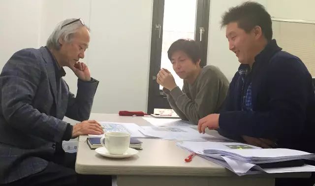 ▲ 小林老师(最左)以及团队设计师探讨项目设计方案