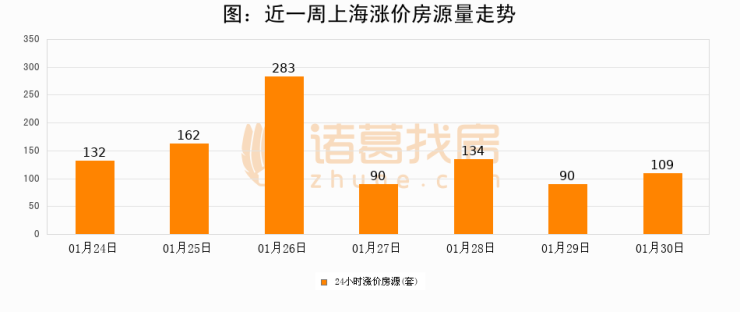 根据诸葛找房数据显示,上海24小时涨价房源量为109套,较01月29日增加19套,环比上涨21.1%。与此同时,涨价房源占比小幅扩大,业主信心有所提升。