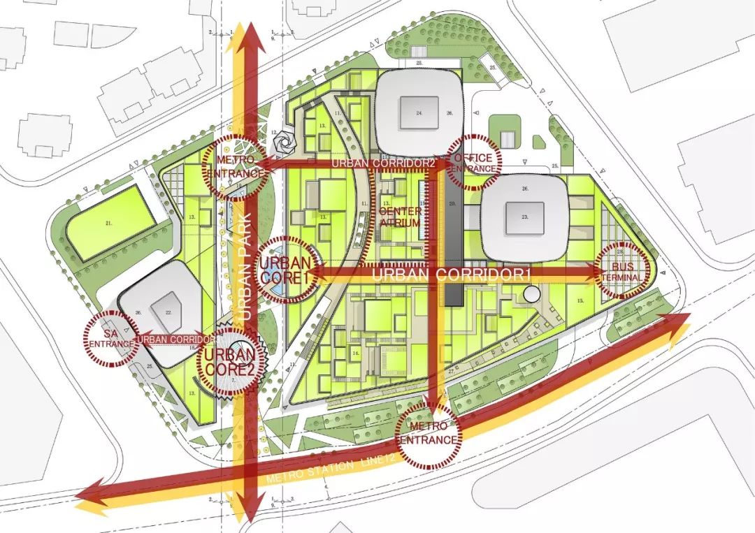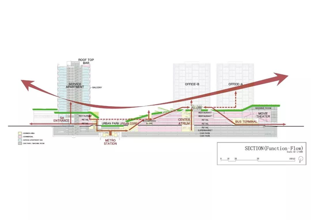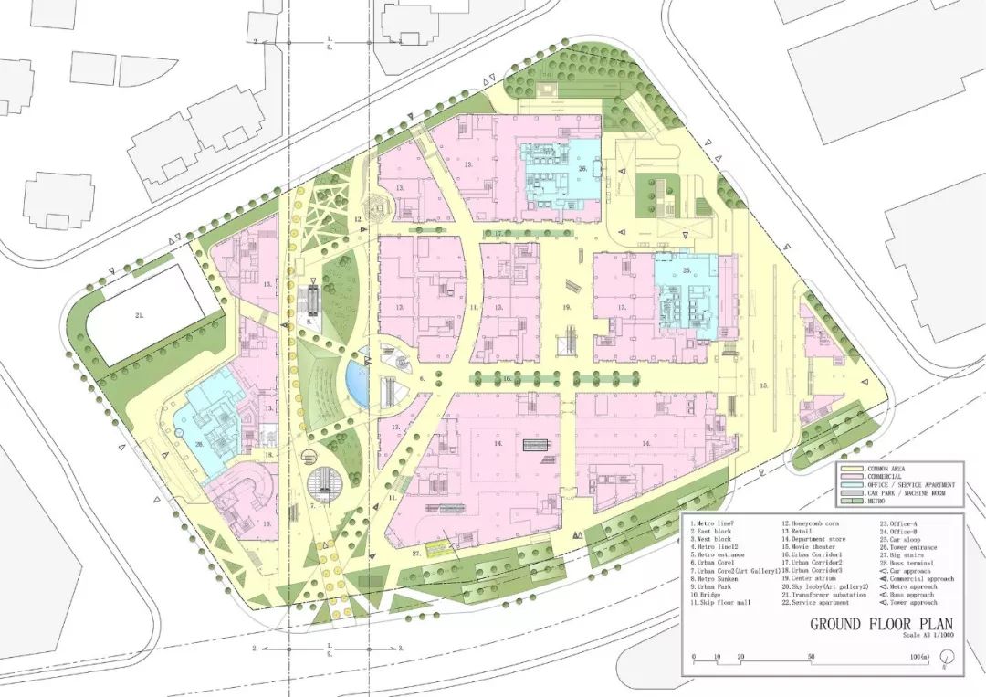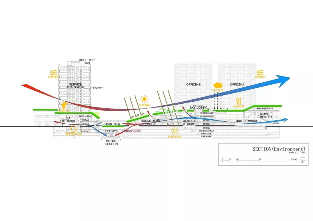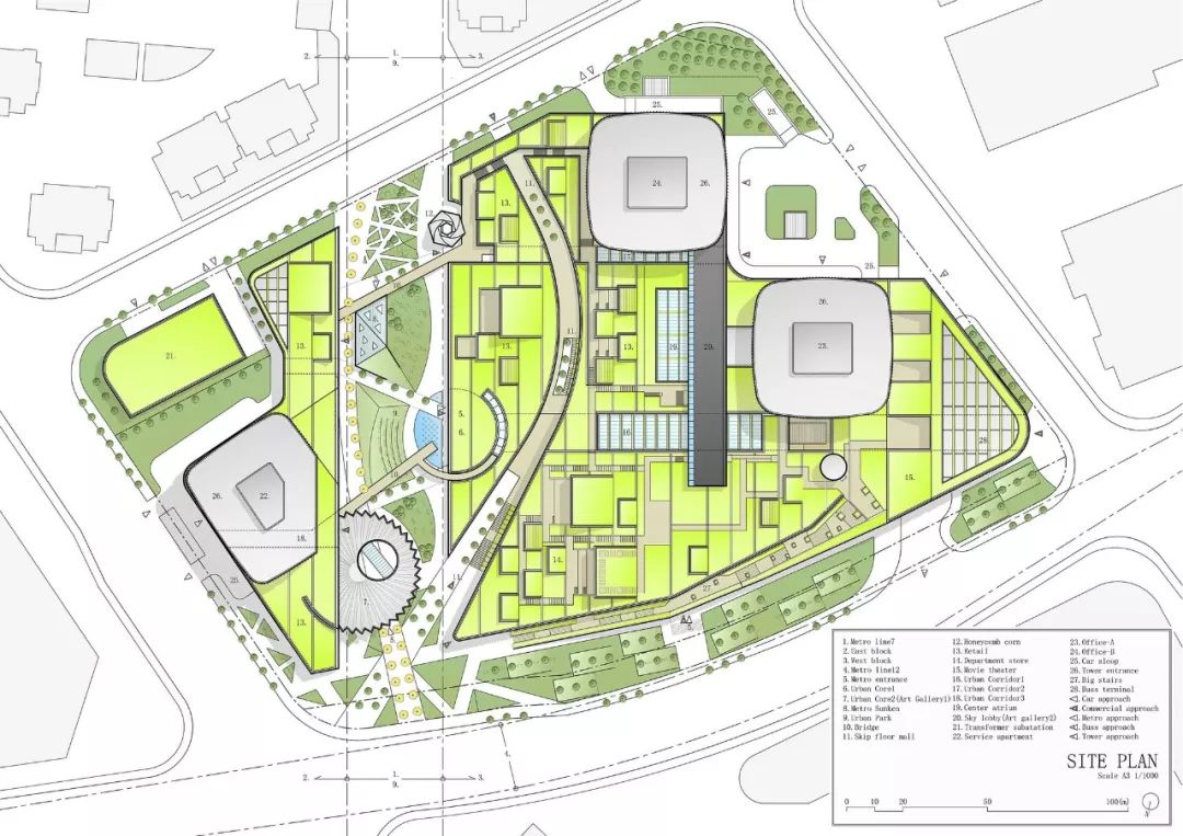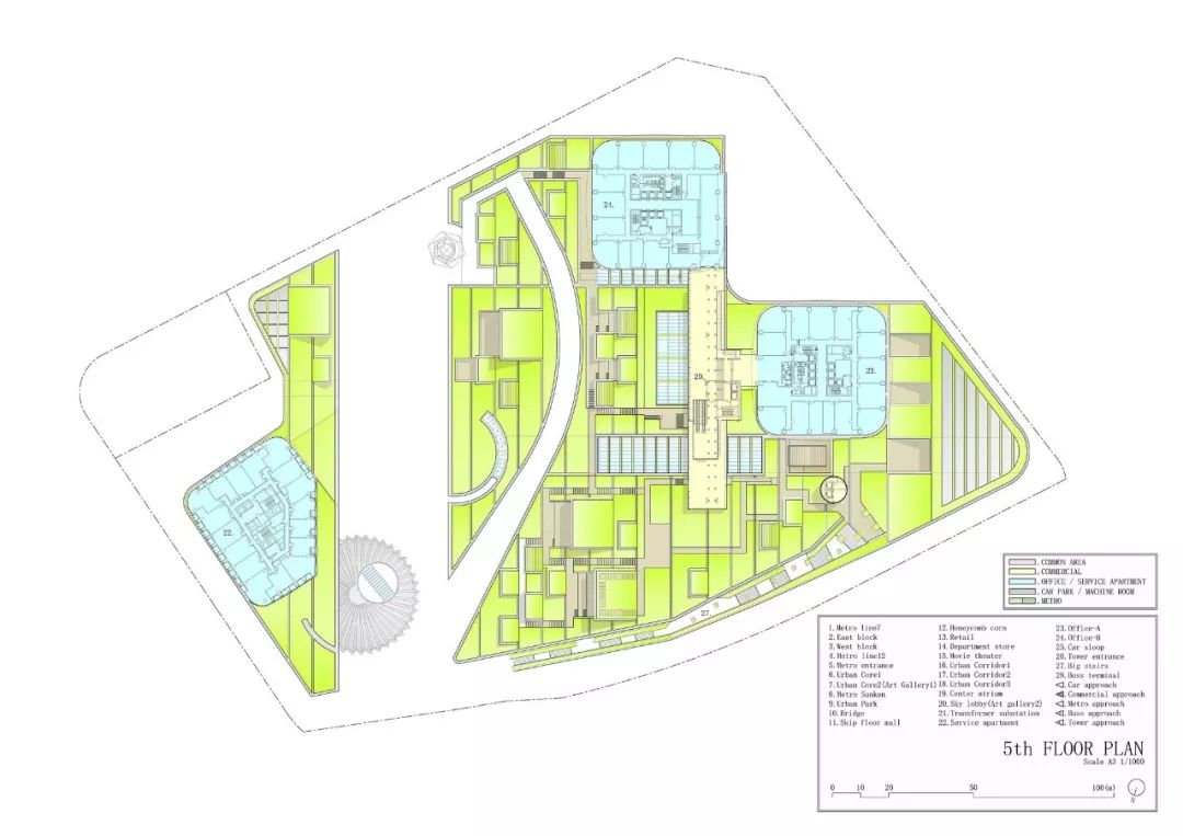 项目简介: 在该项目中,“城市与自然生活相融合的城市农场”是贯穿整个设计的核心理念。这座绿色城市山谷综合建筑,以“街道景观公园”作为建筑空间的亮点,坐落在上海最常用的地铁站正上方。 这座面积为20000平方米的绿色城市山谷综合建筑,以融合自然与人类空间的城市农场为理念设计。通过智能屋顶的几何结构,将其融入城市居民的日常生活中。这座 “屋顶”被分割成不同的大小,并且通过趣味性的露台和户外斜坡以3D的方式将不同的高度连接在一起,同时也响应了下面的建筑功能和室内人们的各项活动。 这座城市综合体很好的利用了大自然的冷却系统来抵消热岛效应,同时也让这里的城市环境和社会环境焕然一新。与我们的自然绿色景观一起,这里的清新环境确保了我们的城市农场是较受欢迎的城市空间。 另外,该城市农场还被确定作为 TOD 项目(以交通为导向的开发项目),具备所有功能:零售、办公和服务公寓都能够通过公共交通顺畅连接。在上海的快速发展的同时,它让每个地方都可以步行到达,创造出了发展城市网络的新价值。