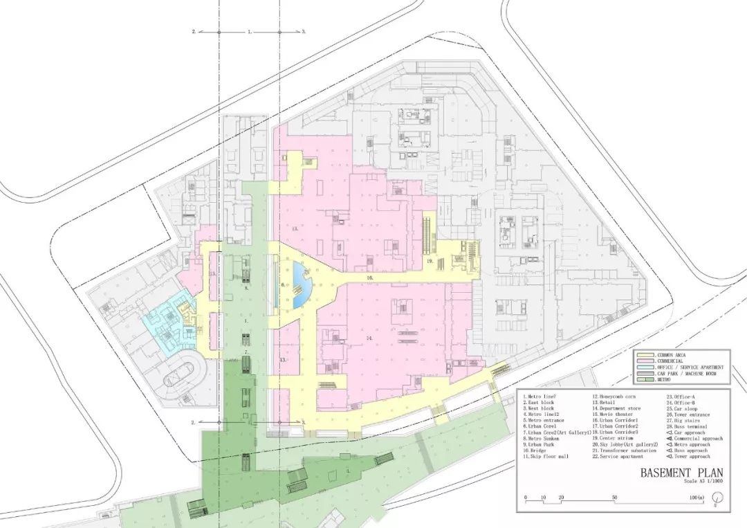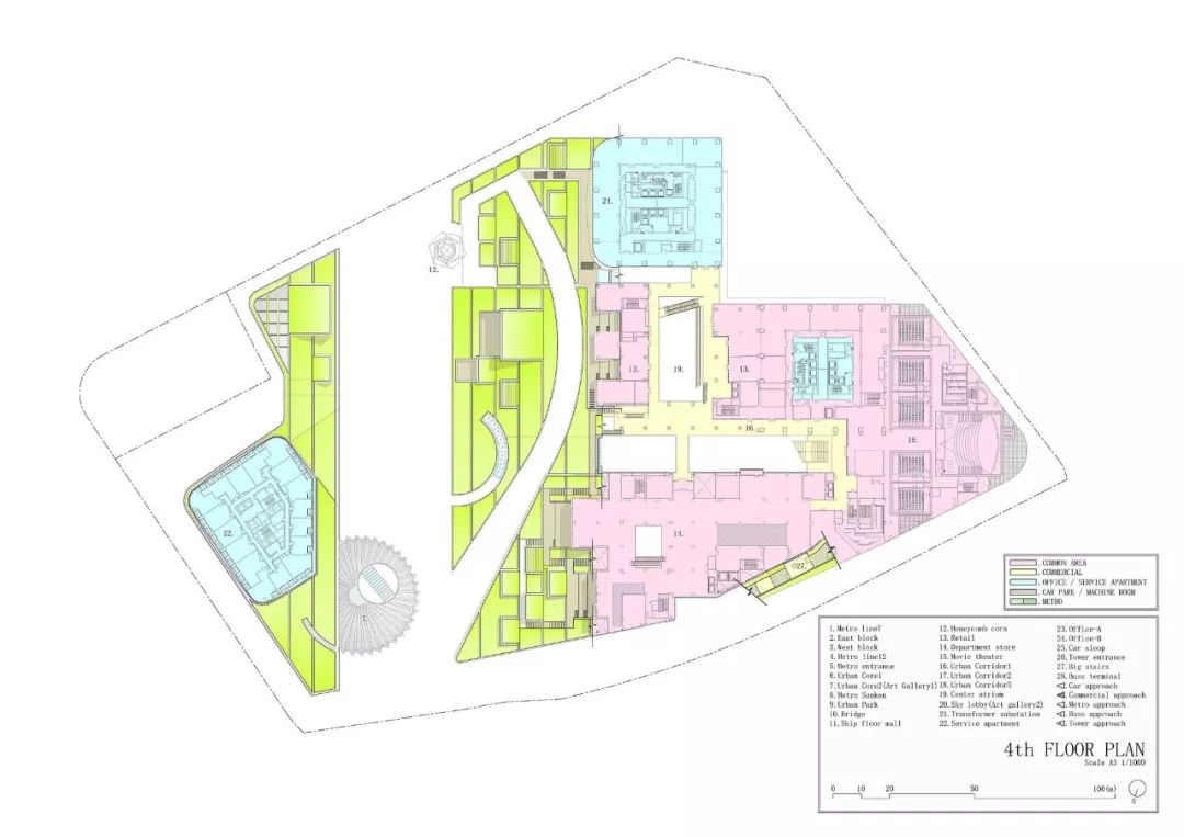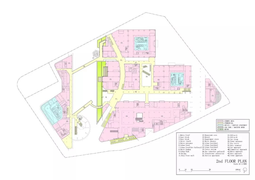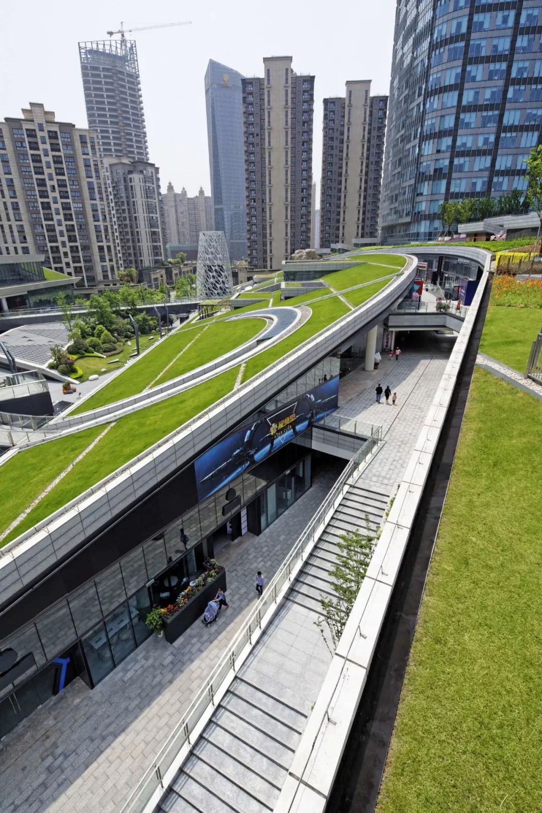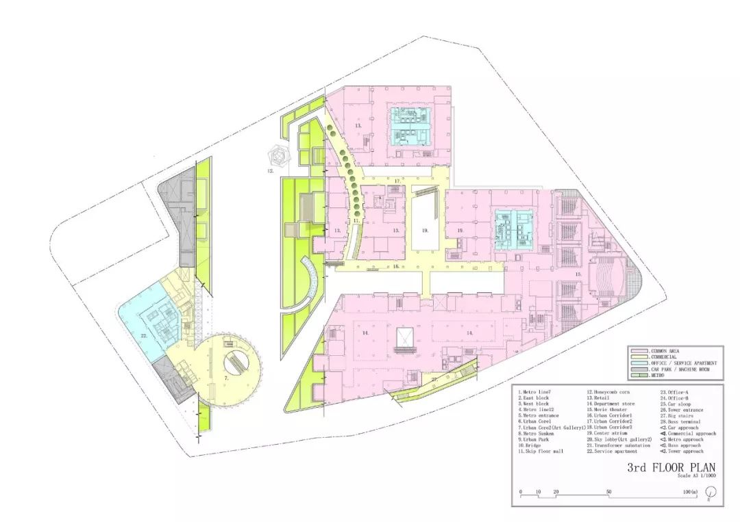 项目简介: 在该项目中,“城市与自然生活相融合的城市农场”是贯穿整个设计的核心理念。这座绿色城市山谷综合建筑,以“街道景观公园”作为建筑空间的亮点,坐落在上海最常用的地铁站正上方。 这座面积为20000平方米的绿色城市山谷综合建筑,以融合自然与人类空间的城市农场为理念设计。通过智能屋顶的几何结构,将其融入城市居民的日常生活中。这座 “屋顶”被分割成不同的大小,并且通过趣味性的露台和户外斜坡以3D的方式将不同的高度连接在一起,同时也响应了下面的建筑功能和室内人们的各项活动。 这座城市综合体很好的利用了大自然的冷却系统来抵消热岛效应,同时也让这里的城市环境和社会环境焕然一新。与我们的自然绿色景观一起,这里的清新环境确保了我们的城市农场是较受欢迎的城市空间。 另外,该城市农场还被确定作为 TOD 项目(以交通为导向的开发项目),具备所有功能:零售、办公和服务公寓都能够通过公共交通顺畅连接。在上海的快速发展的同时,它让每个地方都可以步行到达,创造出了发展城市网络的新价值。