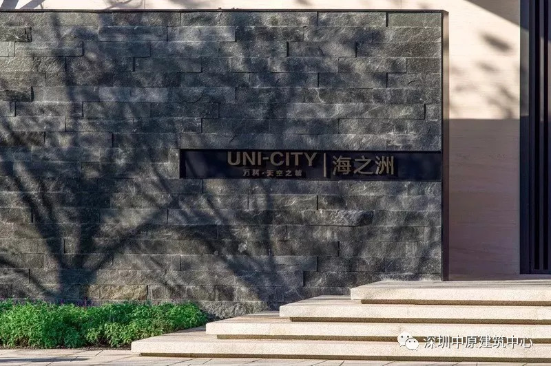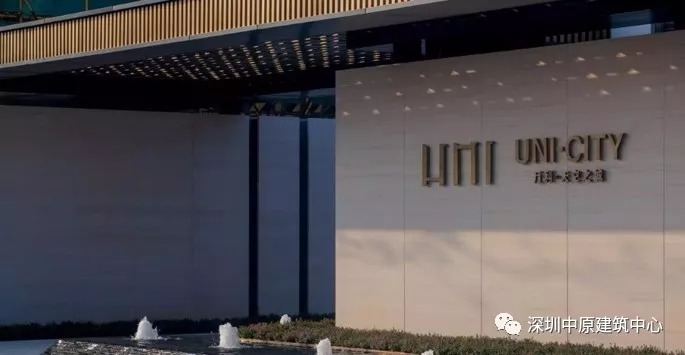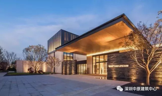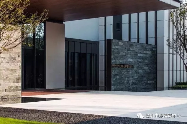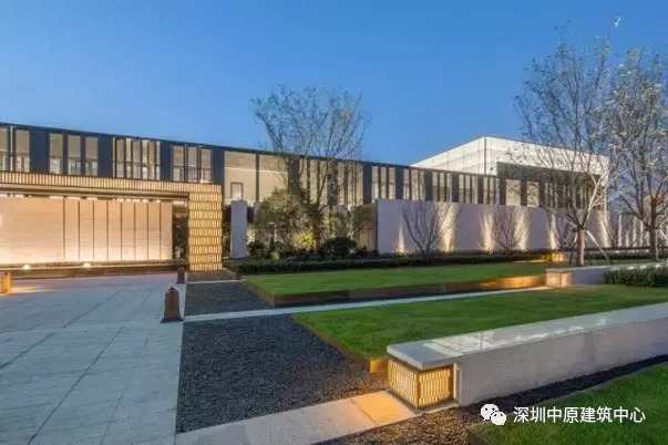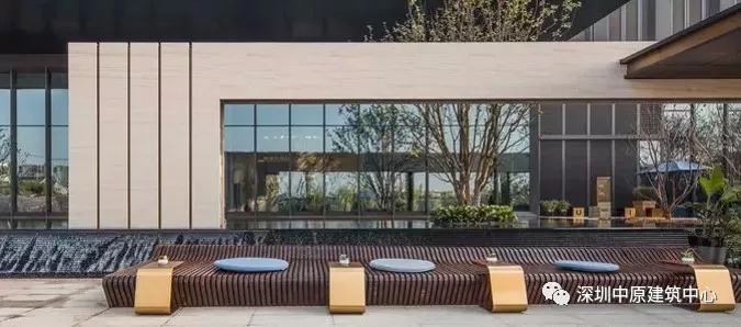 同时黑石英景墙前的镜面水和内院的水隐隐相连,仿佛将整个售楼处轻轻托起,售楼建筑,远远看去像是漂浮的盒子。