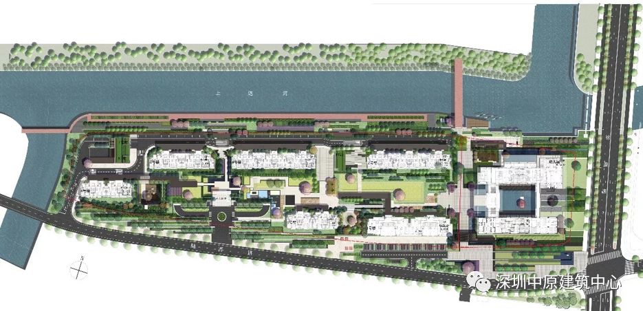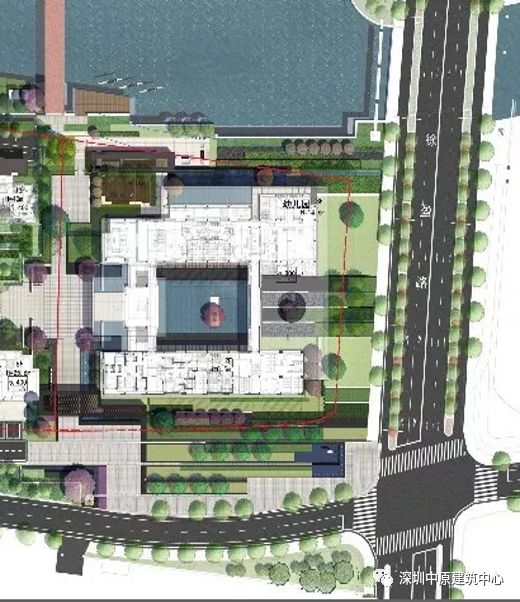 规划和建筑将场地天然区分为五个部分,南侧的城市界面、西侧的中庭,建筑围合的内庭,以及北侧的滨河区,东侧的灰空间。