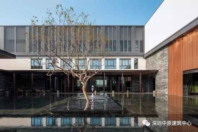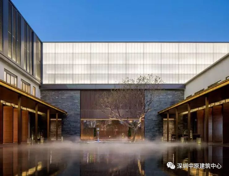 内庭水院是被建筑和长廊围合的空间,在设计过程中,从六棵树到一棵树,从数量到品种上做了多种尝试。最终确定一滴水和一棵树作为天空之城的源头。