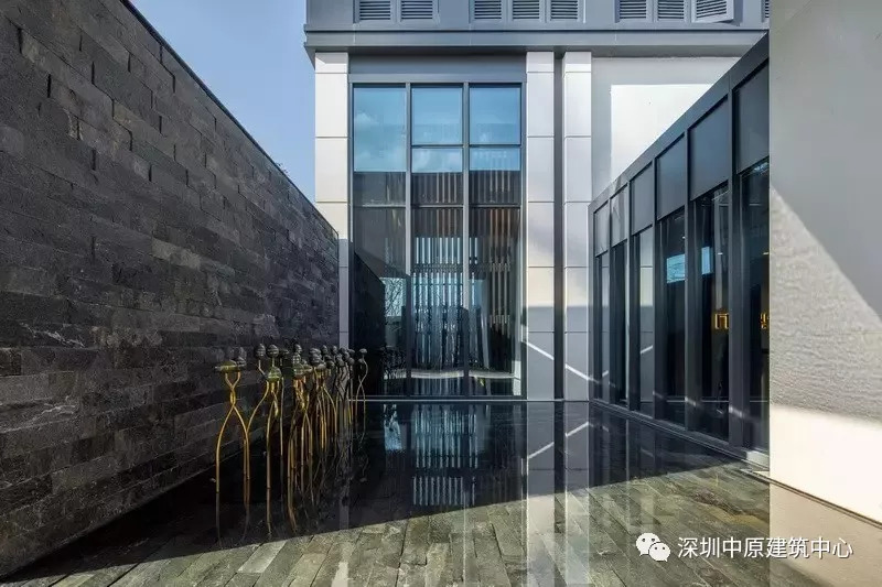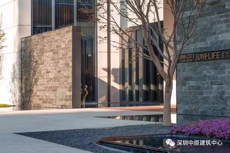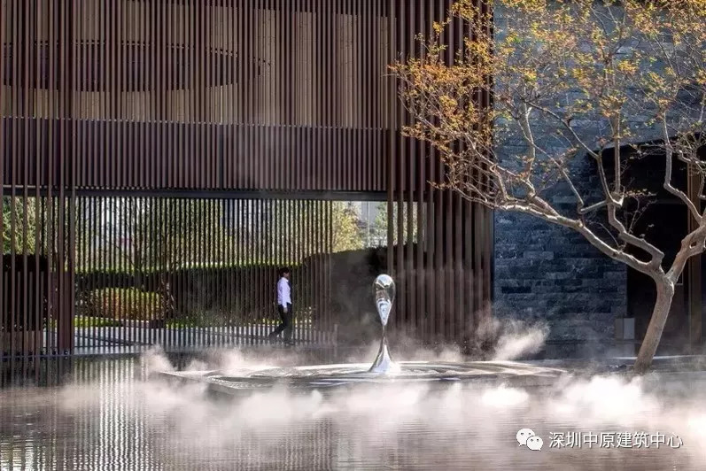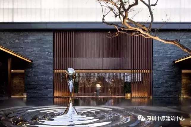 经过了热闹的入口水景,黑石英前的景墙则设计成安静的镜面水,这里是从城市到家、从喧闹到安静的过渡。