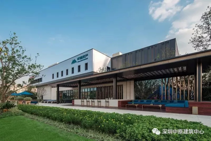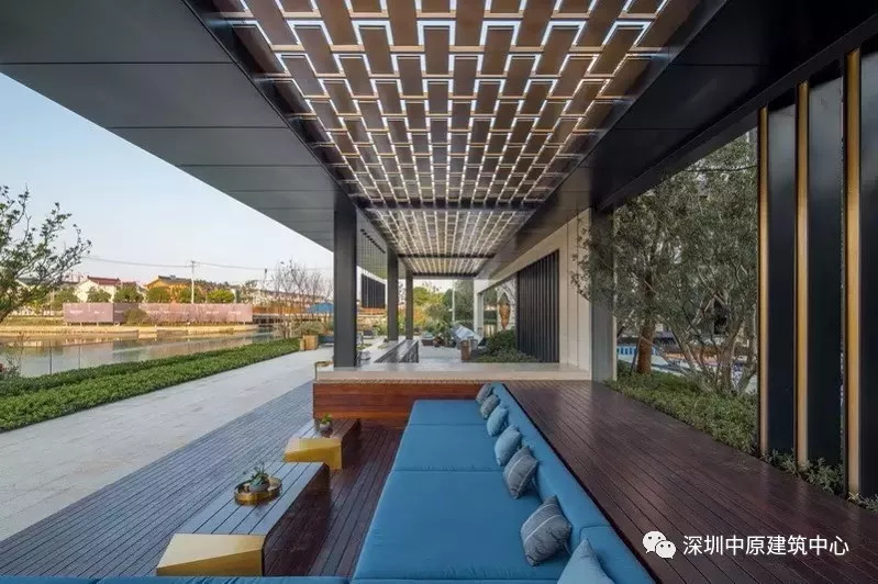 售楼处的落地玻璃正对着北侧的河道,这也是场地最优势的外部资源,因此设计的初始就围绕着如何强化资源优势,完成建筑室内外的串联而进行。