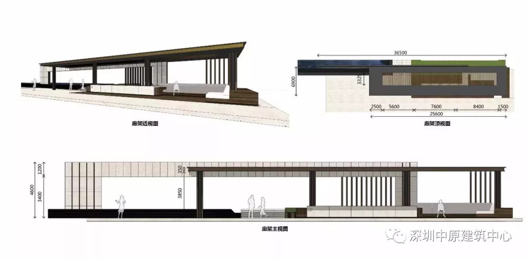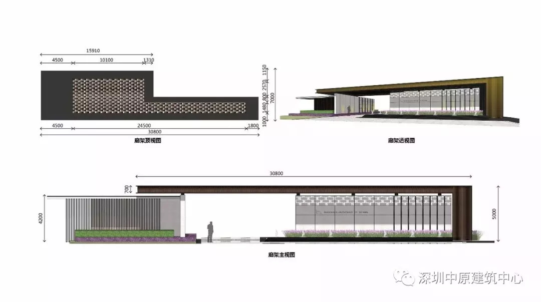 为了更好的与建筑尺度相匹配,入口的序列景墙以及核心主门头的尺度设计的较大,其中门头长达30米,中间跨度大于7米,单柱支撑。
