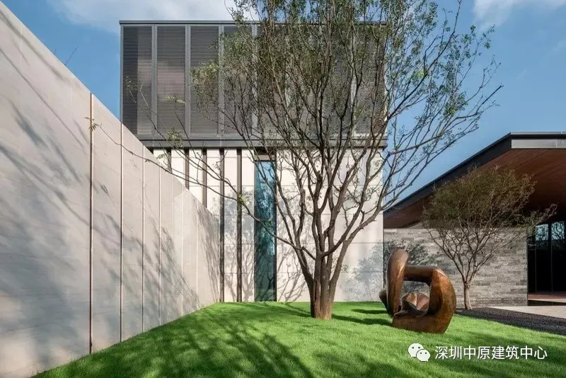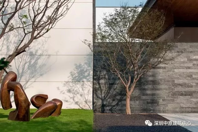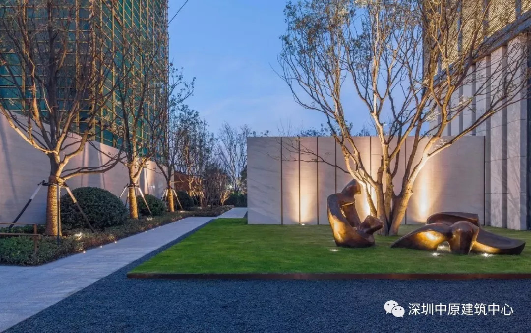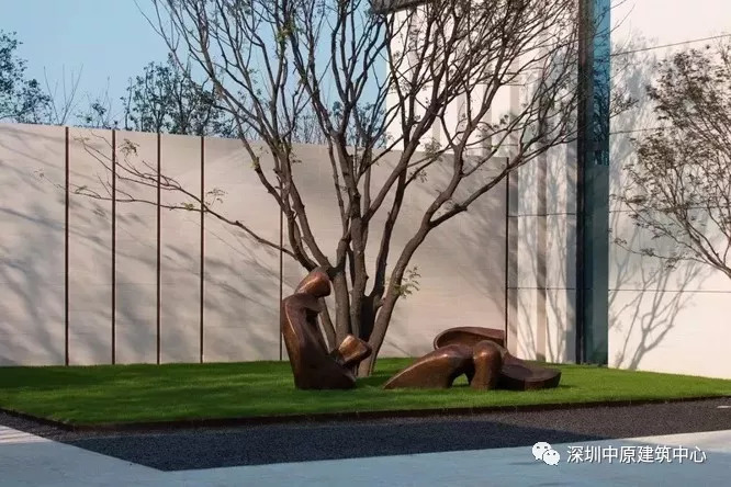 端景选用是一组亨利·摩尔的现代雕塑的变形,在干净的景墙前,一颗精挑细选的黄连木和雕塑共同形成端景,摩尔雕塑的主题和天空之城的文化理念一致,体现的是艺术观念和生活方式所具有的包容性。