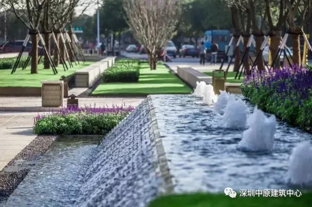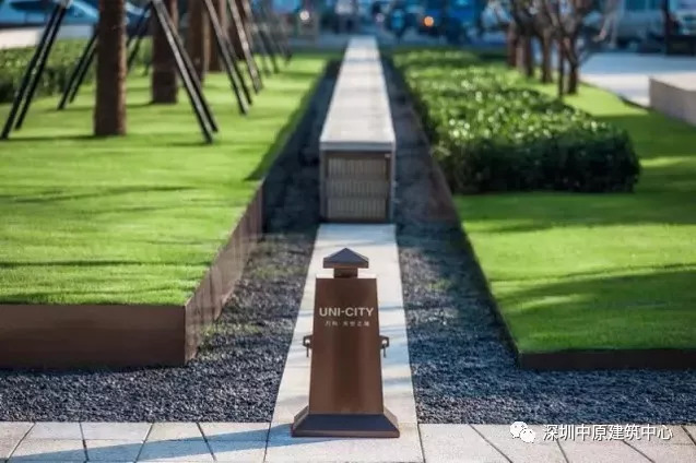 景观设计语言以横线条为基本图形,在重复的骨骼中输入大小不等的的长方形、正方形、但保持骨骼内各单位空间内一定的关系,这些体块分割出最后的功能分区包括细节语言。