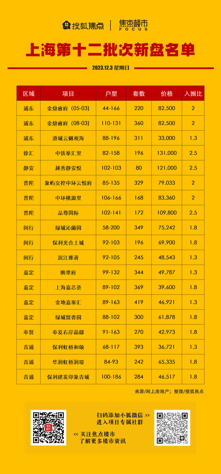 12月3日,网上房地产官微正式公布本市近期将上市新建商品住房项目名单(2023年第12批次):