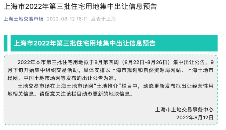今日(8月12日),上海市土地交易事务中心发布“上海市2022年第三批住宅用地集中出让信息预告”。