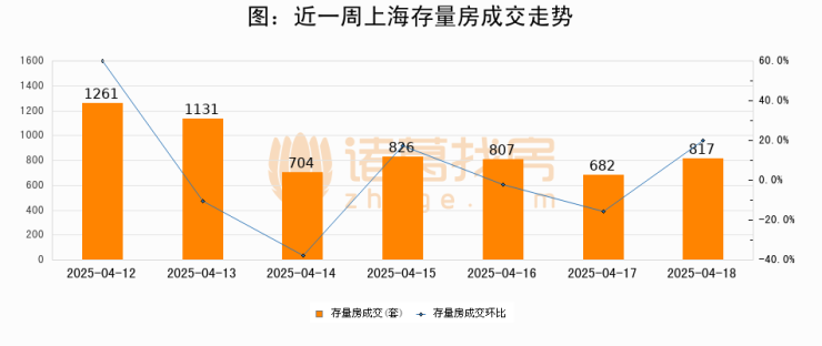 从存量房来看,2025年04月18日上海存量房单日成交817套,比昨日增加135套,环比上涨19.8%。从近一周存量房成交来看,上海存量房日均成交套数为889套,04月18日单日成交817套,低于近一周平均水平8.1%。
