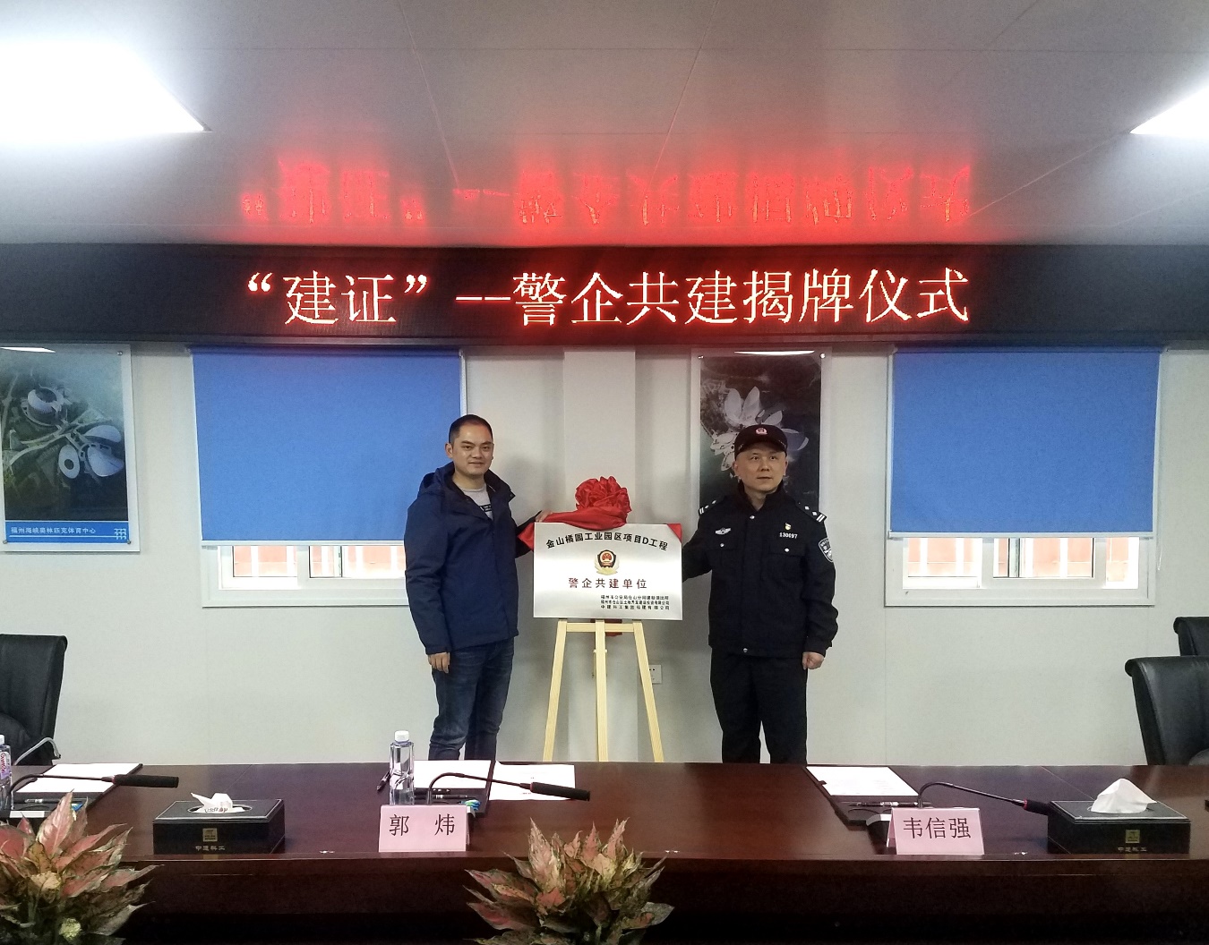 与会人员一道观看了中建科工宣传片。项目经理林经雄对建新所警官们的到来表示欢迎,并简要介绍了中建科工集团福建有限公司的发展趋势以及金山橘园工业园区项目D概况。建新派出所郭炜副所长对中建科工在仓山区注册属地化法人单位表示赞赏,并指出警企共建签约及揭牌仪式拉开了共建的序幕,接下来将完善共建机制,强化警企联动机制,共创和谐平安的施工环境。建新派出所郭炜副所长最后和项目经理林经雄共同为“警企共建